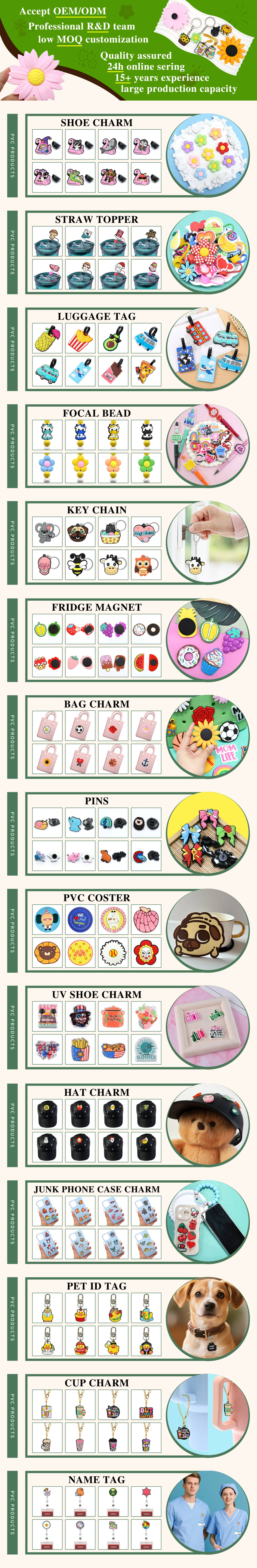 Productos principales:Dijes de zapatos CROC, llaveros de PVC, adornos de paja, cuentas focales, imán de nevera